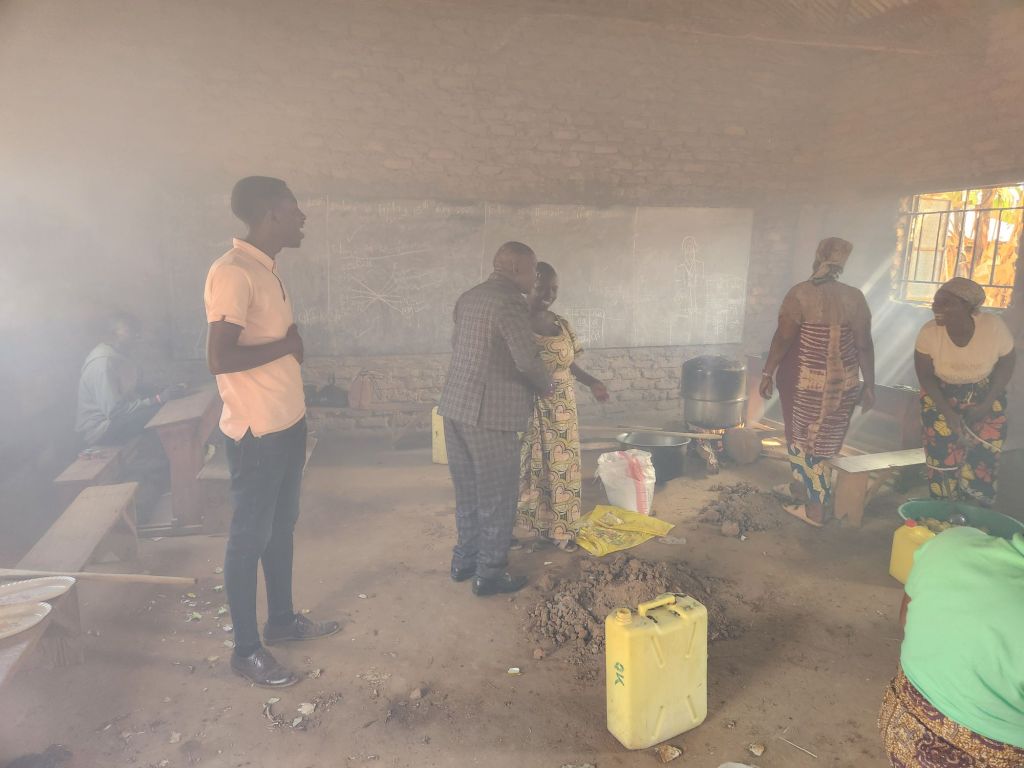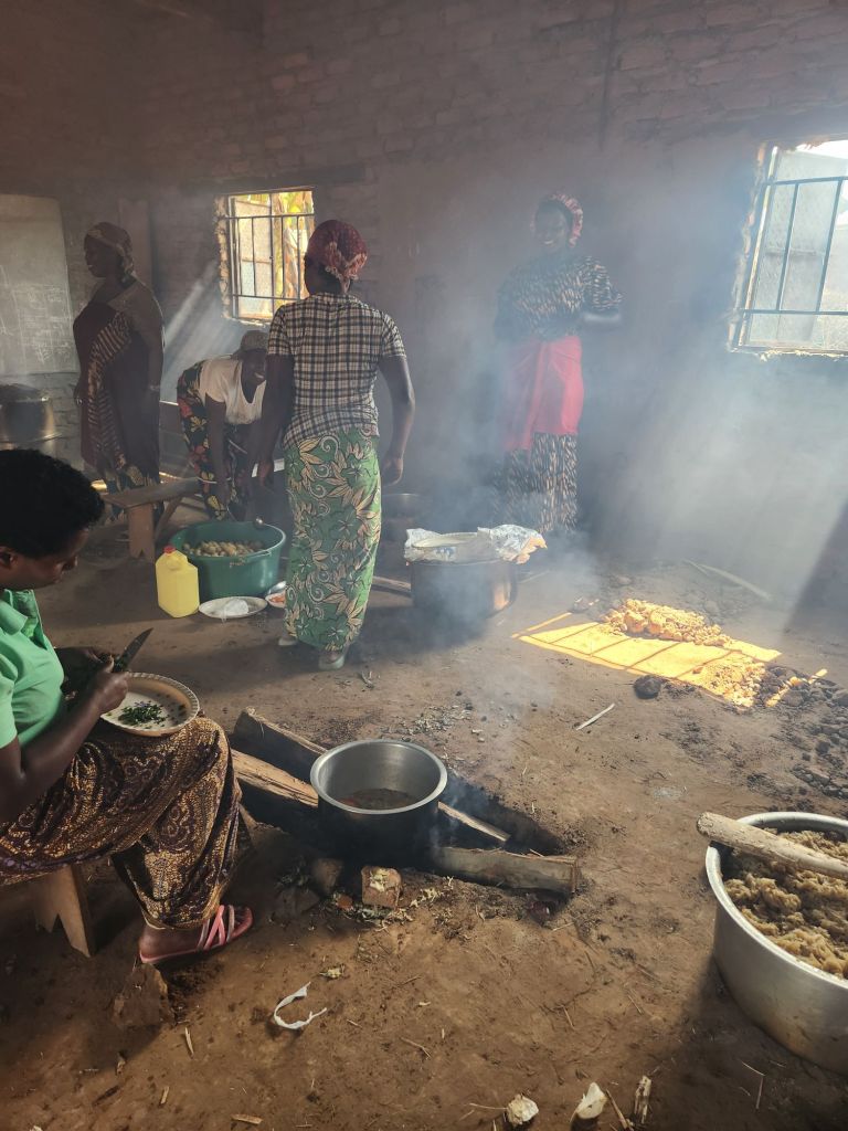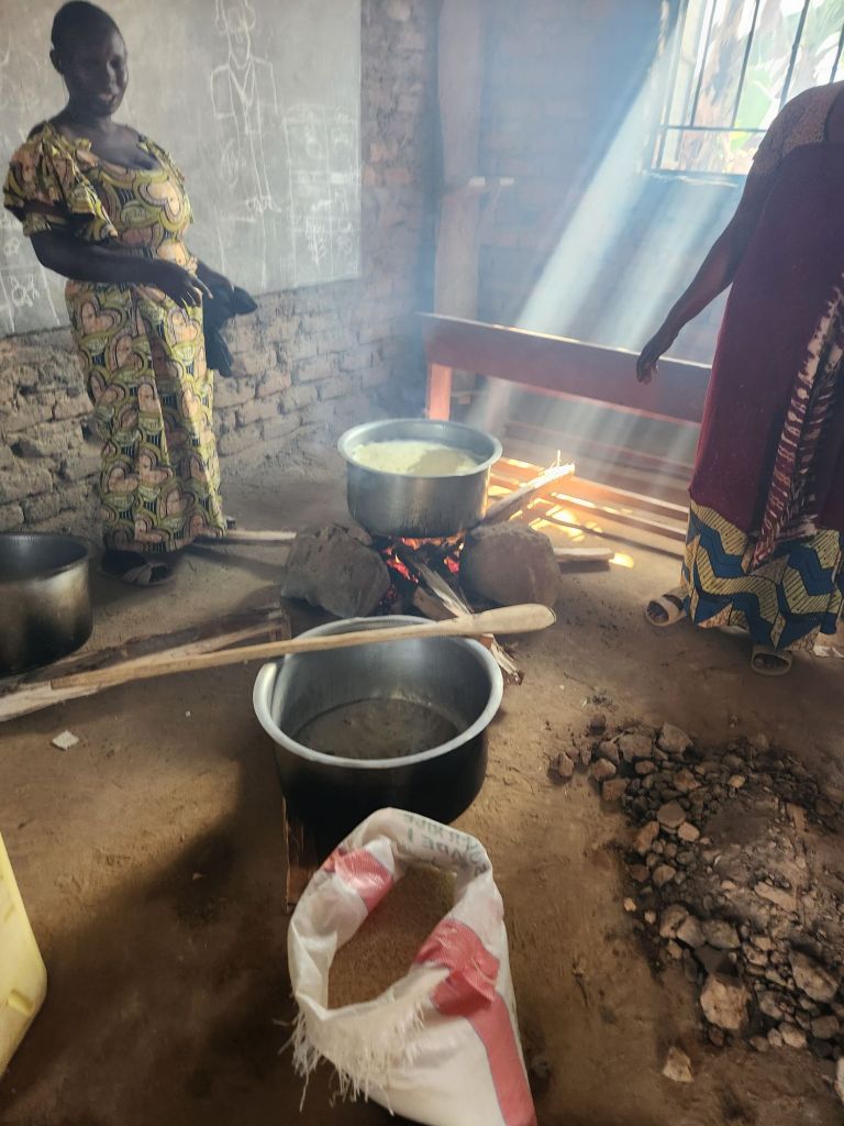 The kitchen to prepare the meal is one of the school classrooms. They simply dig a few pits on the dirt floor and build the cook fires in them. You can see in the below photos how thick the smoke is. I could hardly stand it long enough to take the photos.